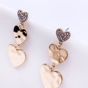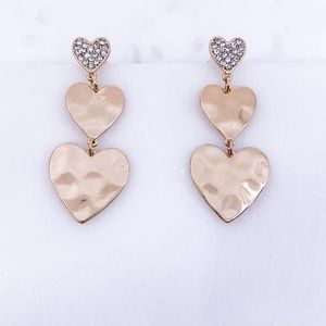These beautiful three heart hammered gold on the bottom two and rhinestone encrusted on the top heart post earrings are sure to steal your heart! Approx drop of earrings is 2” items $14 & under are price firm Closet closing for good June 30th❣️ April my closet will be on hold. May & June will be my final months of sales. I have already reduced prices 45-50% on boutique items. Final price or Price firm are firm. All items left July 1st will be donated❣️
