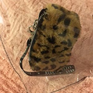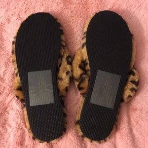 Leopard print fuzzy slippers (Size Medium 7-8) with a matching scrunchy and coin purse. All is faux fur.