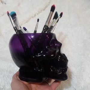 Purple glass skull shaped make-up brush holder. Could also be used to hols paintbrush, pens, jewlery, ext. Purple with almost an ombre effect. Great for your everyday goth creppy with gothic deco needs or just for Halloween and day of the dead. New with tag. Feel free to ask questions or request more photos. I do bundle discounts and accept offers. Thanks for looking and happy poshing!