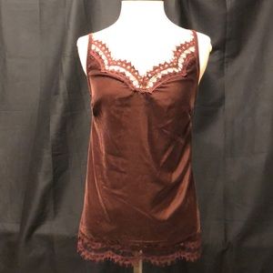 Brand new never worn beautiful Bordeaux color camisole style top. Very elegant and soft. Perfect to wear with slacks, a skirt, or even jeans. Fabric lining on the inside.