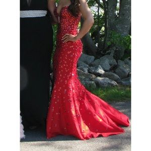 Red Jovani gown altered to size 0/2. I am 5’1 and wore 4inch heels. Would accommodate any one 5’5 or shorter. Only worn once