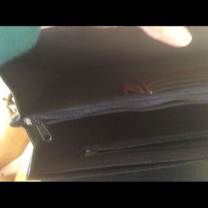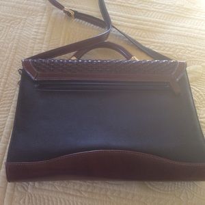 Black trimmed in brown basket weave. Messenger bag style. Approximately 10” x 14”. Outside back and two inside zipper pockets.