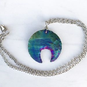 Boho / druzy quartz reversible side necklace / steel necklace / crescent moon necklace / upside down moon / horn / natural stone necklace / gypsy / bohemian / moonchild / astrological / women gift / choker / wire wrap pendants / Handmade by me π Genuine druzy quartz moon . Purple yellow one side and the other green blue . 18 inch stainless Steel chain . ( If you need a different chain just lmk ! ) Allergy free / tarnish free β¨π wire wrap stones
