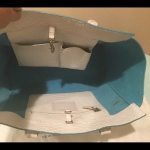 2 White & Tiffany Blue Tassels Adorn the Outside Of The Bag