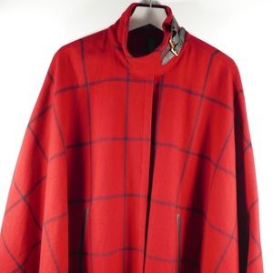 Authentic vintage, red plaid cape coat by Lauren Ralph Lauren (Ralph Lauren’s diffusion brand). Cape has a button & adjustable double buckle closure at the neckline. This cozy chic 80s/90s era piece has two, usable front pockets & provides lots of body coverage. Super cool/dramatic piece.