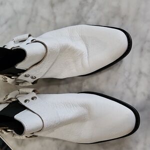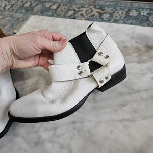 ASOS brand real leather boots. Size 4 UK/ size 6 US. Worn once (inside the house) and were just a smidge too small. Some very minor scuff from storage on one spot where the white finish scraped off on the inner side of the strap