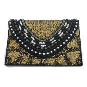 Gorgeous hand beaded black and gold envelope clutch by T&J Designs. This clutch will add a wow factor to any outfit. Detailed hand beading throughout. Attachable chain to wear as a crossbody or over the shoulder. Plenty of room inside for cell phone, keys, cards, and lip gloss.