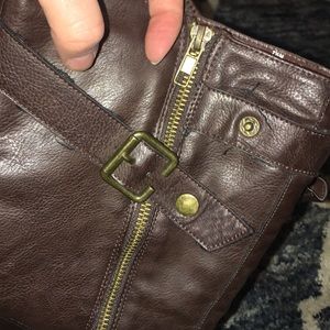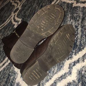 Size 7.5 Nicole brand “Scottsdale” boot in dark brown. 15.5 inches tall. Two buckle straps that are actually snap button closures. Zips down the outside of leg. These have some threads coming from the straps and soles are a bit dirty but otherwise in good used condition. See photos for threads and soles.