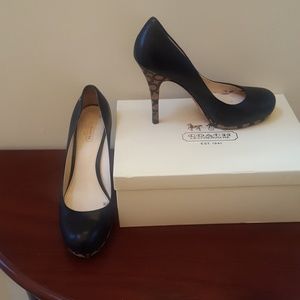 GUC Black Leather Coach Alexa size 8 round toed pumps. Beautiful black smooth leather. Coach C enbossed on wooden heel and 1/8 in platform make shoes mire fun. Padded insole. Great for date nights, going out and work. Super fun. Hate to part with but work at home now. Will ship in original box.