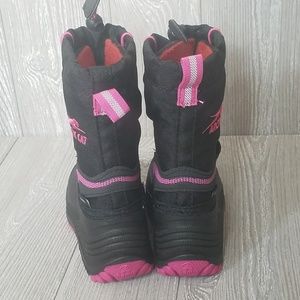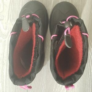 These little girls snowmobiling boots are perfect for winter. They feature a waterproof bottom and water resistant upper. Pink and black with full red liner and pull at the top to cinch and keep snow out.