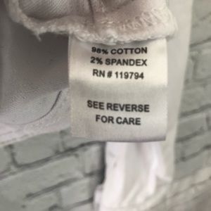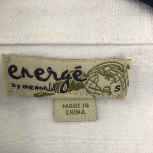 White denim jacket. Side and chest pockets. Button front. Buttons on sleeves and back.