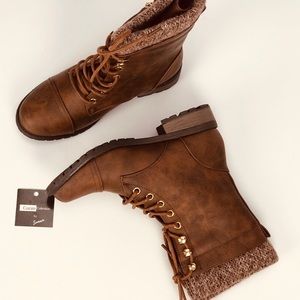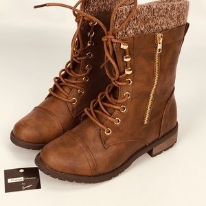 These are a classic brown combat boots. Well made with a wool knit lined cuff and thick fabric insulation on the inside making these boots super comfy and cozy to slip into! Lace ups work brass rivet finishes, a sturdy brass zipper side opening and reinforced toes with a top stitch detail.