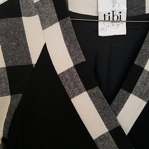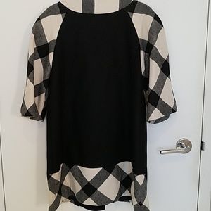 This spring coat is chic and classic! One of a kind! Black and white plaid sleeves and v neck trim. Plaid on hem. One black button with two hidden snaps. 3 quarter sleeves.
