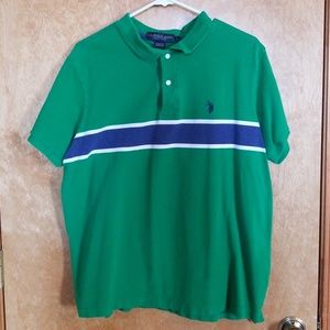 Green polo with navy and white stripe across chest. 100% cotton