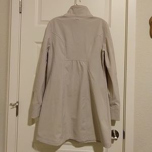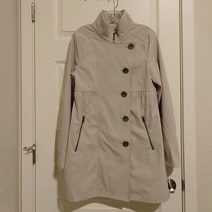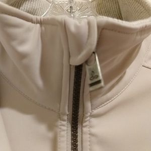 Beautiful and water resistant jacket from Prana in sand color! Features both zipper closure and buttons. Only used a handful of times. Does have a few faint marks on front bottom (photo 6).