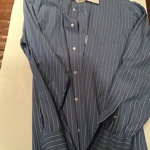 faconnable shirt in blue and white stripes. Cotton. French designer. White collar.