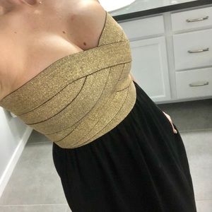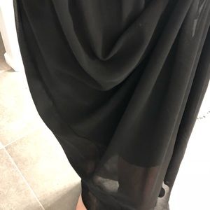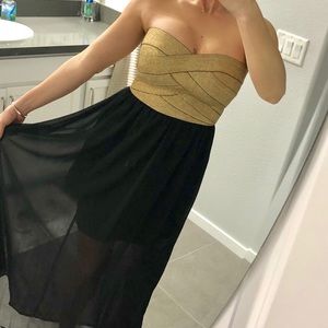 Size small. Gorgeous! Body tight tube top and sheer black maxi with black attached slip.