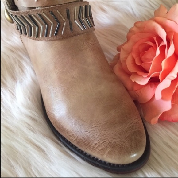 Rock out with the most feminine western ankle bootie. Made with this gorgeous Dk Taupe color with perfect distressed detail(every boot will be distressed uniquely) and decorated with cute bracelet like straps, one with a faux suede with little beads. Wear them with your favorite skinny jeans, or a skirt. I recommend ordering half size smaller than your usual size.