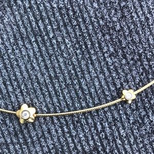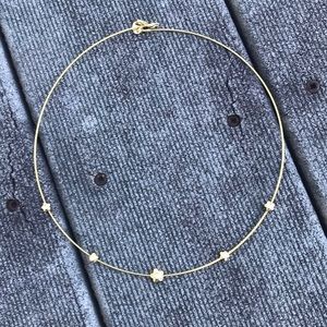 A structured necklace meant to encircle your neck. Is gold in color with the little flowers having small white gems in them. The necklace is approximately 18 inches. Has a lobster claw closure. Flexible on Price! Happy Poshing! 😊