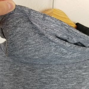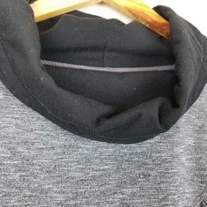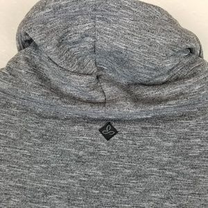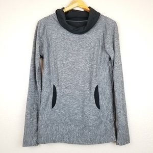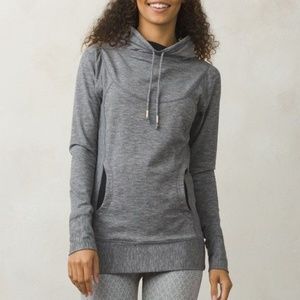 Pullover cowl neck sweatshirt top called the 'Ember Top'. Heather gray with black fabric lining the neck and pocket. "Quick drying stretch fabric" -PrAna website.