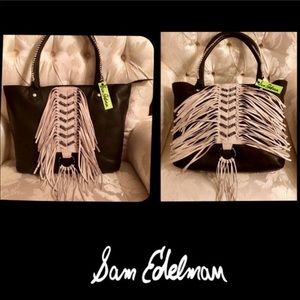 Sam Edelman knows how to let you be free willed🖤flirty and free-spirited with this fringe tote that's amazingly spacious as it is free🖤luxurious leather🖤with suede trim🖤center has black/white beading🖤dripping in elegance🖤13Wx10 1/4Hx4" D🖤8" double rolled handles🖤1 inside zip pocket🖤with metal logo plate🖤2 wall pockets🖤protective feet,on bottom🖤fringe & ring detail🖤top zip closure🖤silver logo hardware🍒DISCONTINUED🍒