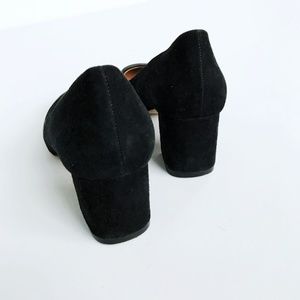 Great pair of classic, black suede block heels by J. Crew Factory. Good used condition other than a little paper left on the bottom sole from the sticker.
