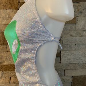 Brand new without tags, perfect condition. “Rolita Rave Couture Space Out Bodysuit wants to go on a little trip! This sik bodysuit features metallic sparkles all over with a neon disco sparkle alien head detail on tha front and crop circular sides. With a high neckline that snaps shut, this stretchy bodysuit also has a tie back so this bb hangs on no matter where yer trippin’ to.” from website. Size Small.