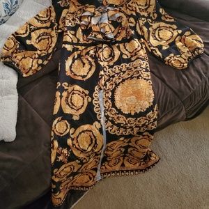 Striking & silky to the touch duster, Romantic ruffle neck with button-up closure and a tie-waist. Wear w/ a great pair of jeans beneath or dress is up with a sexy skirt.