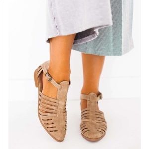 Strappy summer flat with an ankle zipper and side buckle.