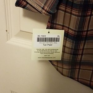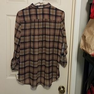 Cute semi sheer tan and navy plaid blouse. Would be super cute with your favorite Jean's and boots.