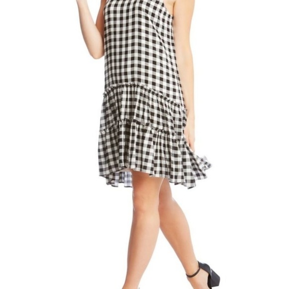 Shoulder-baring rayon dress with gingham print and ruffled detail