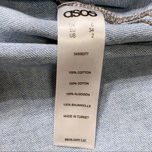 ASOS Denim, long sleeve light wash buttondown blouse. Cold shoulder sleeves, button sleeve cuffs, bust slip pockets, slightly loose fit, longer length. Great condition. Measurements in photos.