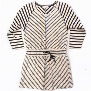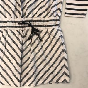 black and off white striped dress. Dolman sleeve with drawstring waist and front pockets. Sweatshirt like material (not super heavy) 100% cotton