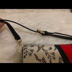 tory burch cross-body handbag with adjustable strip. 7’’ x 4.3’’. Strip can be adjusted from 33’’ to 36’’. Strip is removable. This handbag is kept in dust bag since bought. It’s rarely worn and in good condition.