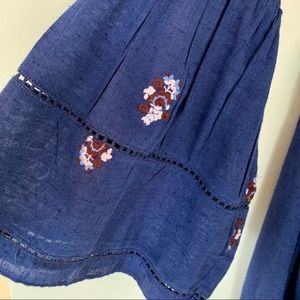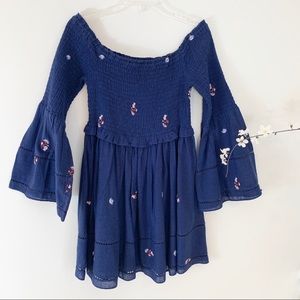 Free People Counting Daisies dress keeps your look trendy with the smocking body and floral embroidery accent. With off shoulder detail, this dress will add a boho vibe to your closet. Great side pockets. Pretty details with eyelet on the bell sleeves and hem.