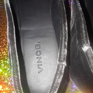Black velvet loafers by Vince. Imprint line on one shoe from being bound together.