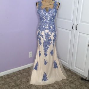Gorgeous fitted prom or mardi gras gown- champagne underlay with cornflower blue lace adorned with sequences to add just the right elegant glamour- flares out just a touch to add to this dramatic dress