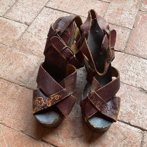 Brown and oxblood VINTAGE 60s style leather tooled platform heels