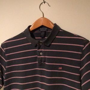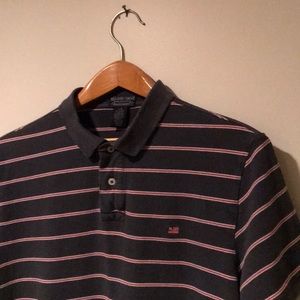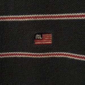 Deep green with a thin red strip sort of way. 2 button placard at the neck. Tag says large, but would fit a medium nicely.