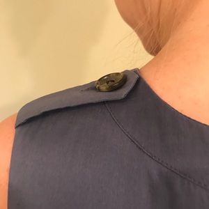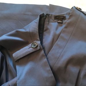 Ann Taylor blue fitted sheath dress, deep v neck. Front and back zippers with hook-and-eye closure in back. Sleeveless, pockets in front. Shoulder detail with buttons. Slit in back for ease of wear. Tailored fit. Lined.