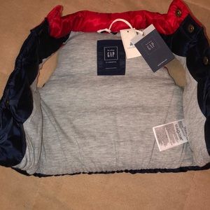 Vest is from Baby Gap, color is red and navy