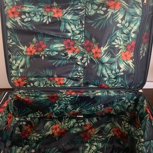 NWT! Beautiful Tommy Bahama suitcase. Navy and white stripe exterior complimented by a colorful floral interior. Lightweight. Top telescopic handle. 3 flat handles. 2 way zip-around closure with lockable pulls. Exterior features 1 exterior zip pocket and 4 bottom 360 degree wheels. Interior: 1 zip pocket, 2 slip pockets, and adjustable garment straps. Approx 29” H x 19” W x 10.5-12.5” D.