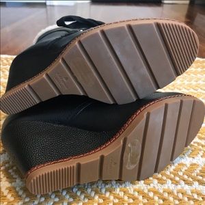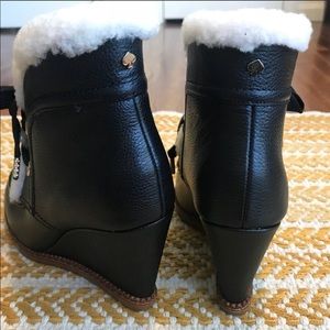 No box. Shearling trim adds a cozy texture to these pebbled leather kate spade new york booties. Lace-up closure. Covered wedge. Rubber sole. Size 6.
