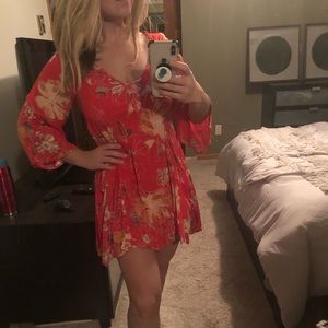 Free People Mini dress “Eyes On You”. Sleeves 3/4 and pockets in the front. Worn a few times but it’s in great condition. The back is a little longer, like a mini mermaid 🧜♀️. Partially lined.