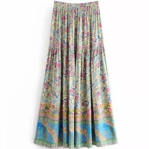 Stunning vintage look contrast print, elastic waist plus drawstring, slit up right side to leave open or tie up, contrast, bottom, contrast hip band. Cotton