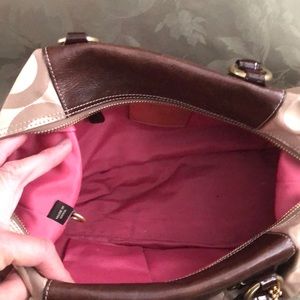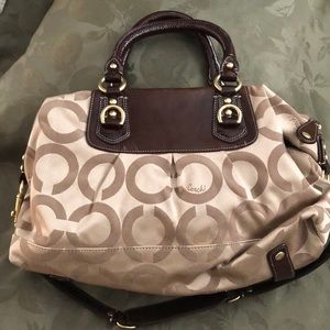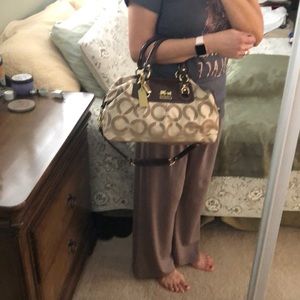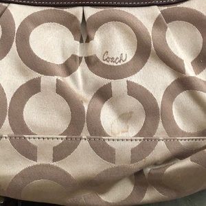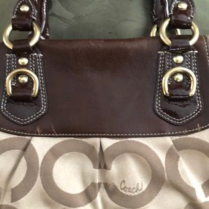Tan cotton with big Cs. Brown leather trim. Goldtone hardware. Long strap for shoulder. In side has pink lining with zip pocket and two slip pockets. Some tiny scratches on leather and small spot on back of bag. No trades