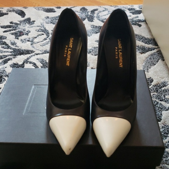 I'm selling a LIKE NEW pair of black and white stunning pumps by Yves Saint Laurent. I wore them ONCE!!! There is a tiny scuff on the point of the pump and a slight tear on the bottom of the heel (see photos). These shoes are a show stopper and a great addition to any fashionistas closet!!!!