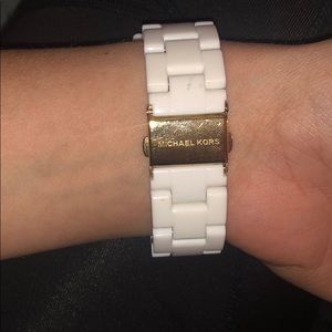 Beautiful Micheal Kors Watch. Sugar bowl logo engraved on the inside. White with rose gold and diamonds. I don’t own the box any longer