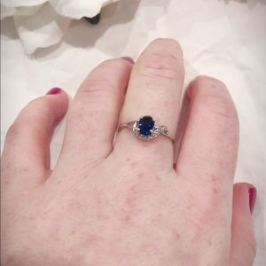 Small white sapphires form a graceful, partial halo. I think this sapphire was created.