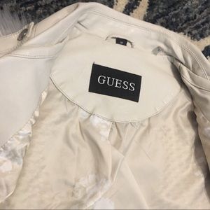 Women’s medium Guess brand faux leather asymmetrical moto jacket, white (more of a muted or off-white) with silver color hardware. Has 2 front pockets. Measures about 18.5 inches across the chest lying flat and zipped. Measures about 23 inches long lying flat. 25 inch sleeves. NWT, retails for $180! Outside “Leather touch” shell facing is 100% Polyurethane and shell backing is %100 Rayon. Filling and lining are %100 Polyester.